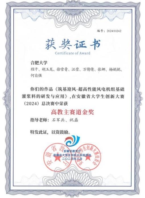 2024年5月,中国国际大学生创新大赛启幕,团队以所研究的风电灌浆料领域为主题报名。备赛期间,商业计划书等材料历经了从无到有、由粗至精的蜕变。历经多轮筛选,四个多月的艰苦比拼,他带领团队突破重围,凭借《筑基迎风—超高性能风电灌浆料的制备与应用》项目荣获省赛金奖。