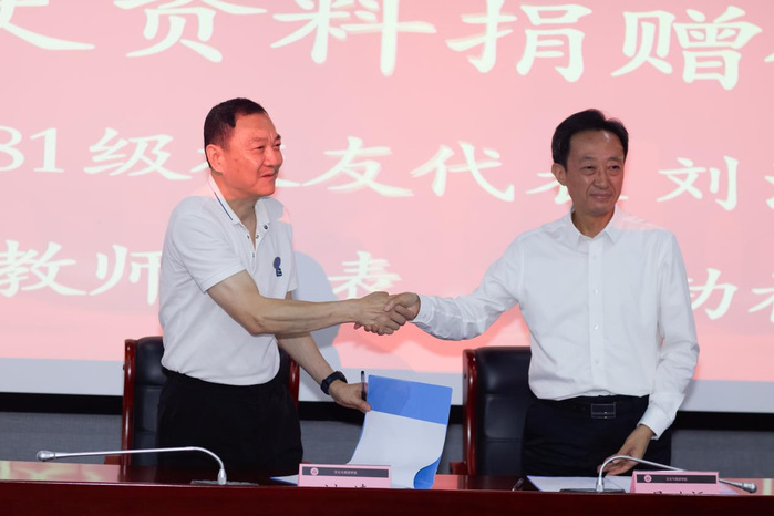 周飞、吴功福代表学校为校友们颁发纪念徽章,接收了校友代表刘清捐赠的珍贵校史资料7类33件,并对校友表示感谢。