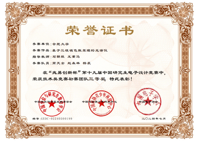 他注重理论与实践结合,积极参与学科竞赛,以团队核心成员身份获中国研究生电子设计竞赛华东赛区三等奖,在备赛过程中,完成光谱数据处理、系统开发及成果展示工作,提升了技术创新和工程应用能力。