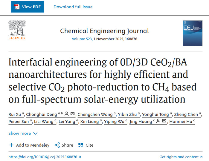 近日,我校能源材料与化工学院邓崇海团队在针对温室气体二氧化碳资源化转化为高附加值合成气(甲烷)方面取得重要研究进展,相关研究成果发表于工程材料类国际权威期刊《Chemical Engineering Journal》(中科院一区TOP,影响因子13.2),题为《Interfacial engineering of 0D/3D CeO2/BA nanoarchitectures for highly efficient and selective CO2 photo-reduction to CH4 based on full-spectrum solar-energy utilization》。