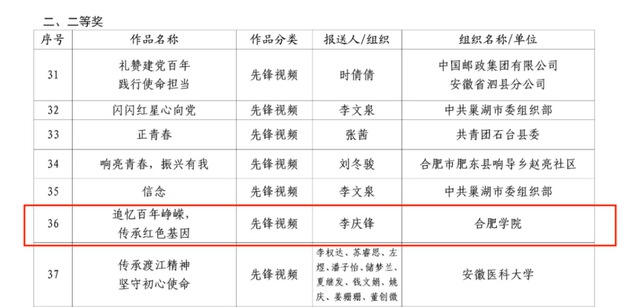 11月30日,中共安徽省委组织部、共青团安徽省委、安徽省学生联合会在全省青年党团员中开展的“青春心向党,百年正芳华”红色信息征集评选活动结果公布,我校参赛作品获得二等奖1项,三等奖1项。