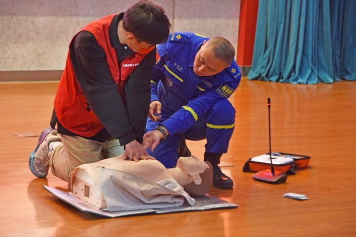 随后,刘晓冬为在场师生讲述了心肺复苏的相关知识,让大家明白了心脏骤停的原因、心肺复苏的完整流程、AED(体外除颤仪)的使用方法及注意事项等,并通过图片展示、真实案例、现场演示等多种方式讲解胸外心脏按压手法、人工呼吸等心肺复苏步骤,让大家掌握了科学的救生常识和整套心肺复苏流程。现场同学积极参与模拟练习,21级机制班孔力同学认为:“在刘书记的专业指导下,我很快掌握了心肺复苏和人工呼吸这两项技能。以后遇到突发情况就不会再束手无策,可以尽自己所能提高身边突发疾病患者的生存几率,这让我感到非常自豪。”