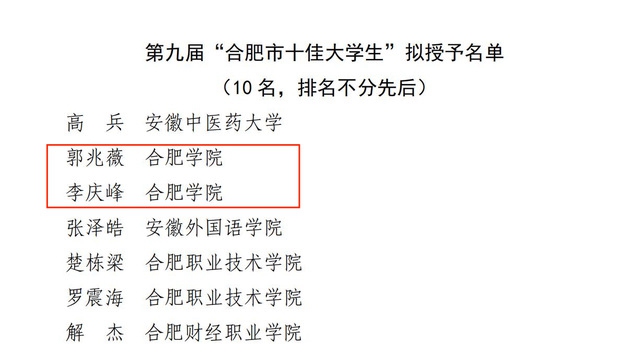 近日,由合肥市教育局、共青团合肥市委员会、合肥市学生联合会共同举办的寻访2021年度“合肥市最美学生”暨第九届“合肥市十佳学生”评选活动结果公布,我校学子郭兆薇、李庆锋荣获“合肥市十佳大学生”称号,邹梦婷、杨成晓荣获“合肥市最美大学生”称号。