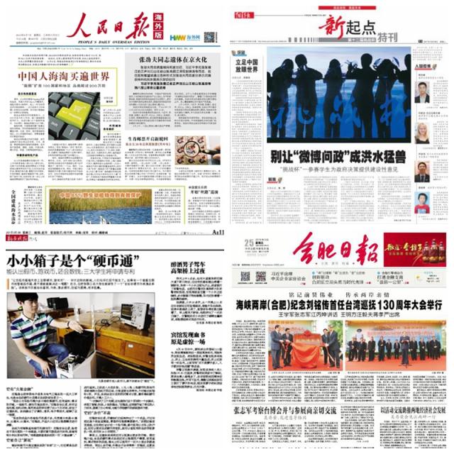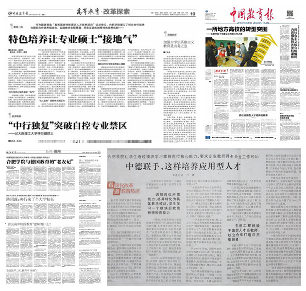 五年来,校外平面媒体共刊发我校报道600余篇,其中人民日报、光明日报、中国日报、中国教育报、中国青年报、中央电视台、安徽日报、安徽电视台等中央和省级重要媒体以及法新社、德国国家电视台等报道我校130多次,新华网、人民网等网络媒体刊发报道180多条,安徽教育网1170余条,其中首页270多条。人民日报《中德联手,这样培养应用型人才》、中国教育报头版《一所地方高校的转型突围》、中国青年报《“小学校”也有“大创意”》、新华网《中国高校改革人才培养模式加速青年创新创业》、中国教育报《特色培养让专业硕士“接地气”》等引起社会积极反响。(宣传部)