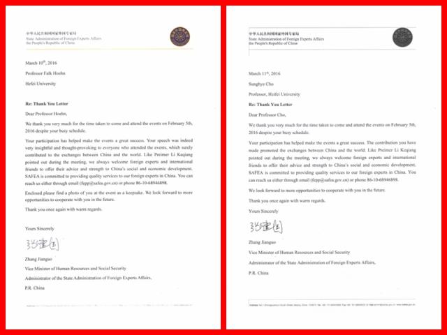 近日,国家人力资源和社会保障部副部长、国家外国专家局局长张建国致信我校两位外国专家,对其于今年2月5日在京出席与李克强总理的新春座谈会等事宜表示感谢。