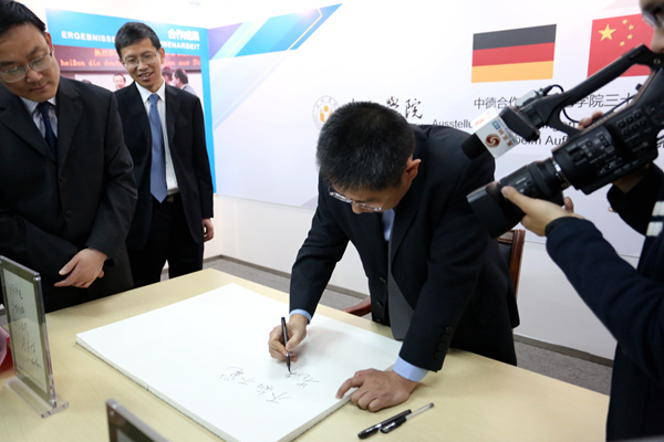 随后,双方共同参观了中德合作共建三十周年成果展,参展过程中,蔡敬民还就学院发展概况、办学定位等做出介绍。在两国总理的留言台处,翟谦为我校题字“不知不觉,先知先觉”。