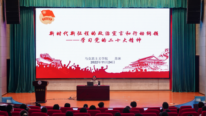 开班仪式后,马克思主义学院副院长(主持工作)、马克思主义学院直属党支部书记苏冰作题为《新时代新征程的政治宣言和行动纲领——学习党的二十大精神》的宣讲报告。