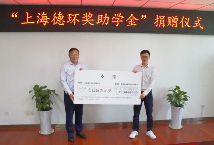 4月20日,“上海德环奖助学金”捐赠仪式在我校行政楼会议室举行。上海德环实业有限公司总经理陈俊,安徽中德教育合作基金会秘书长何世昆,经济与管理学院院长陈江华,经管学院党委副书记、纪委书记夏丹青等参加捐赠仪式。